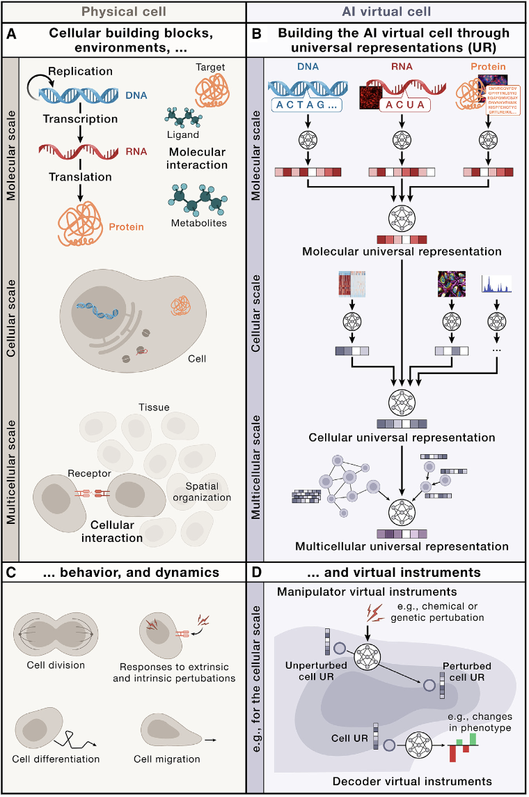 Cells operate on many levels. You have atoms, molecules, and tissues; where changes at one level can trigger large effects at another level. These relationships are not always straightforward. To simulate this, we need unified or universal representations that bridge information between sources like imaging and sequencing.