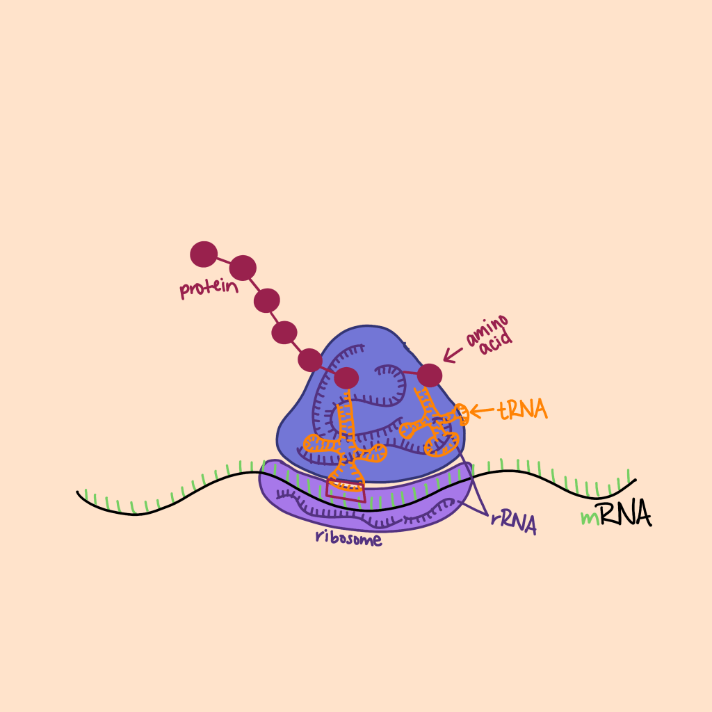 mRNA is fed through your ribosomes made of rRNA where tRNA reads the mRNA strand, 3 nucleic acids at a time. tRNA then attaches the nucleic-trio-corresponding amino acid to the building protein (Figure 2). mRNA is simply a linear strand of nucleotides that serves as a recipe for protein synthesis. Since the discovery of mRNA’s function, it has been at the center of modern biology and resulted in entire fields of research that revolve around it.