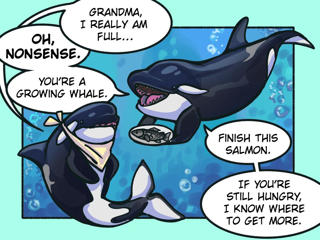 Grandmothers in killer whale societies, in particular, seem to have a lot to offer to their grand-offspring. These matriarchs store extensive ecological knowledge that is crucial to the success of their kin. In a previous study of killer whales led by researchers at the Center for Whale Research, it was found that post-reproductive females improve the probability of survival in their grand-offspring (Nattrass et al., 2019). In addition, post-reproductive females are the most likely to lead salmon foraging endeavors, especially during times when the abundance of salmon is low (Brent et al., 2015). The importance of post-reproductive females is especially relevant for highly endangered populations of whales, such as the J Pod, who frequent Puget Sound in the Pacific Northwest.