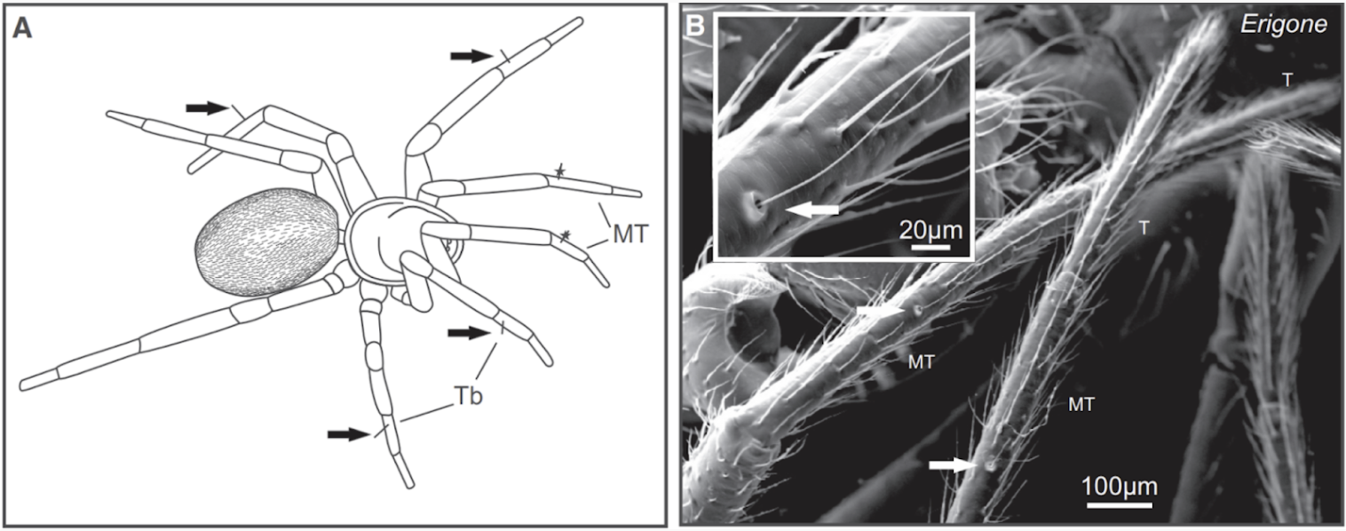 What follows are some provocative experiments that demonstrate the impact a changing electric field in a windless environment has on spider behaviors correlated with ballooning, like tip-toeing and abdomen pointing. When there is no electric field, the spiders will hang out and remain ground dwellers. But as the electric field strength increases more and more, the spiders get on those tippy-toes and start shooting strands of silk into the air.Okay, so it seems plausible that the spiders use the electric field to gauge conditions for flight. But the natural question that arises is, how? As it turns out, spiders possess these microscopic hairs on their legs called trichobothria. They found that changing the electric field would necessarily deflect the trichobothria versus other, non-electrical sensing hairs. So there we have it, spiders use these little hairs to sense the conditions of the electric field and will shoot strands of silk to drag them into the air. Spiders do not fly, they levitate. If that is nightmare fuel for you, please watch this video where the authors use electric fields to levitate a spider.