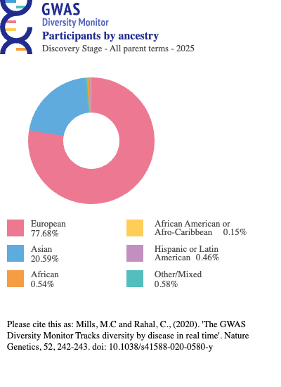 In 2009, Need and Goldstein conducted the first quantitative review of ancestral diversity in GWAS and found that 96% of participants were of European descent (Need and Goldstein 2009). By 2016, Popejoy and Fullerton’s work in Nature reported this figure had gone down to 81%, with individuals of Asian ancestry comprising 14% and those of African ancestry a mere 3% (Popejoy and Fullerton 2016). By 2021, the proportion with European ancestry climbed up to 86% (Mills and Rahal 2020). For a more recent depiction of the ancestry distribution in GWAS, see Figure 1, and if you are further interested visit https://gwasdiversitymonitor.com/. In terms of geographical concentration, 72% of participants in these studies were from just three countries – the United States, the United Kingdom and Iceland (Mills and Rahal 2019). In other words, the map of the human genome and its links to disease has been drawn almost entirely from a single neighborhood.